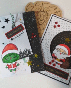 Los fondos los crearon con papeles navideños de Action, combinando estampados y colores, y añadieron lentejuelas para darle ese toque de brillo tan característico de la Navidad. Cada tarjeta es diferente, única, y refleja la personalidad y creatividad de quien la ha hecho.